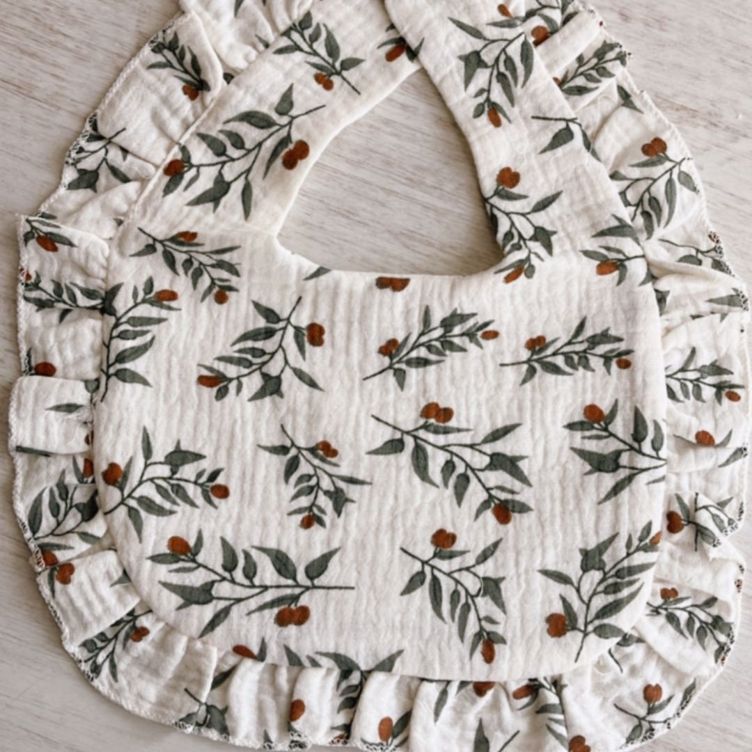 Babero de muselina, con diseño y vuelitos.