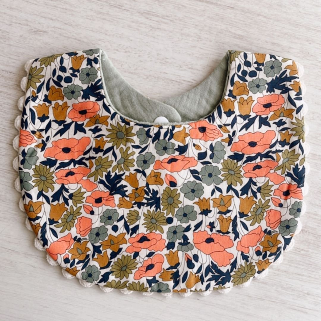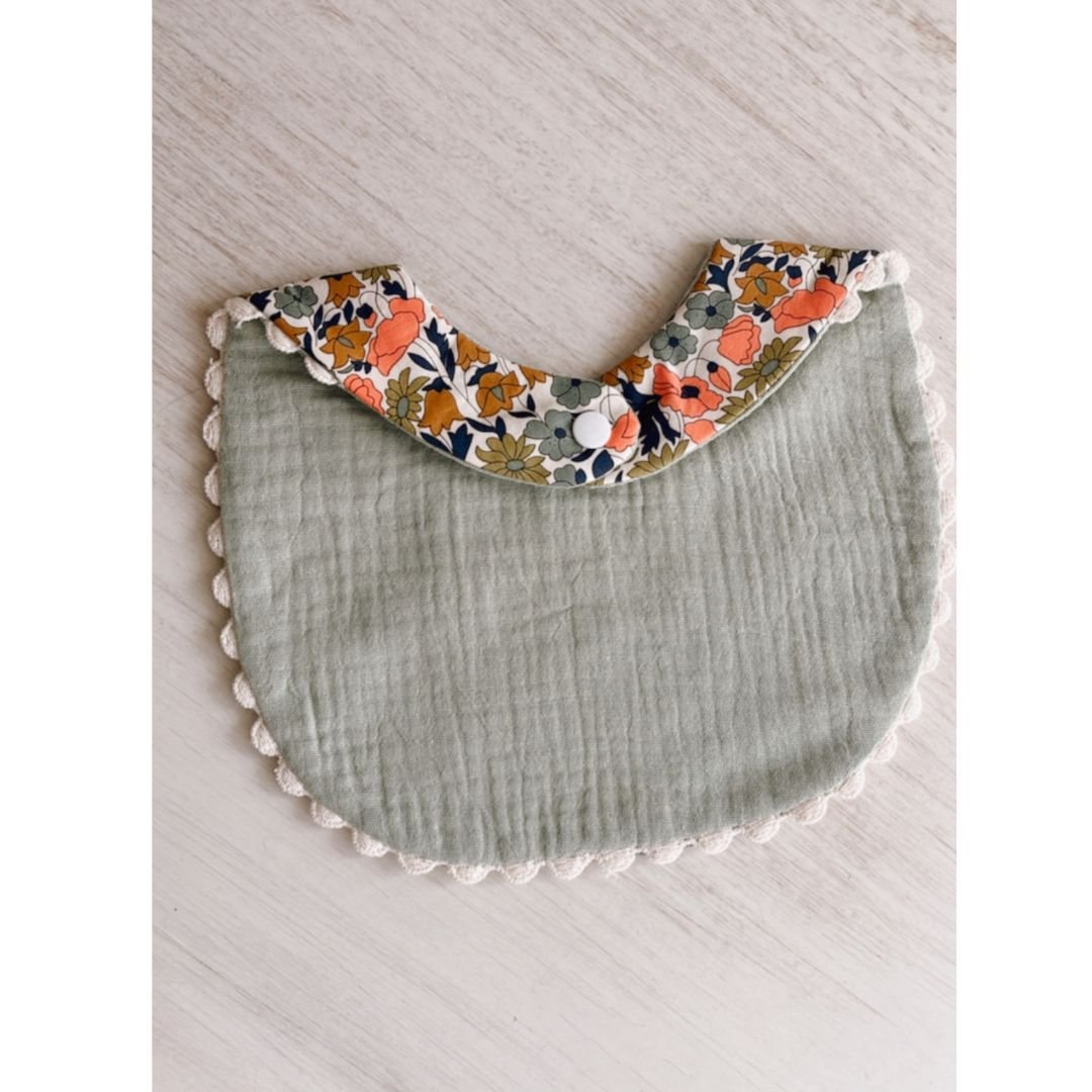 Hermoso babero reversible, diseño de flores por un lado y color liso verde agua. detalles en las orillas, cierre con botones a presión.