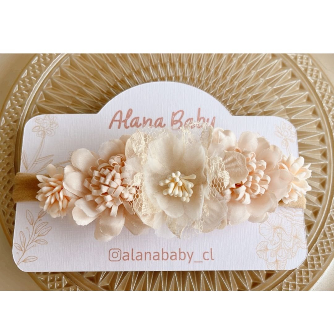 Corona de flores color crema con diseño de flores en diferentes tamaños y texturas