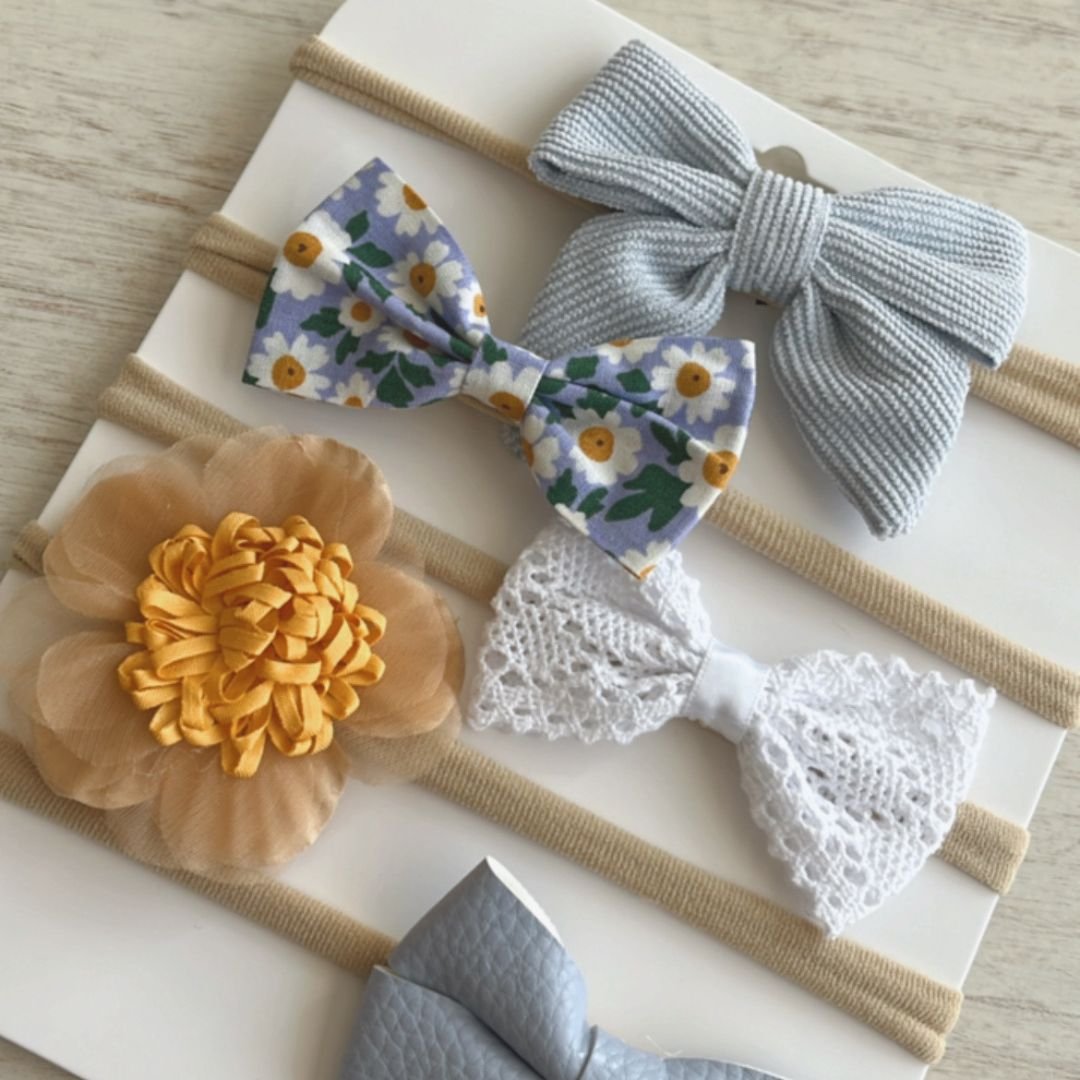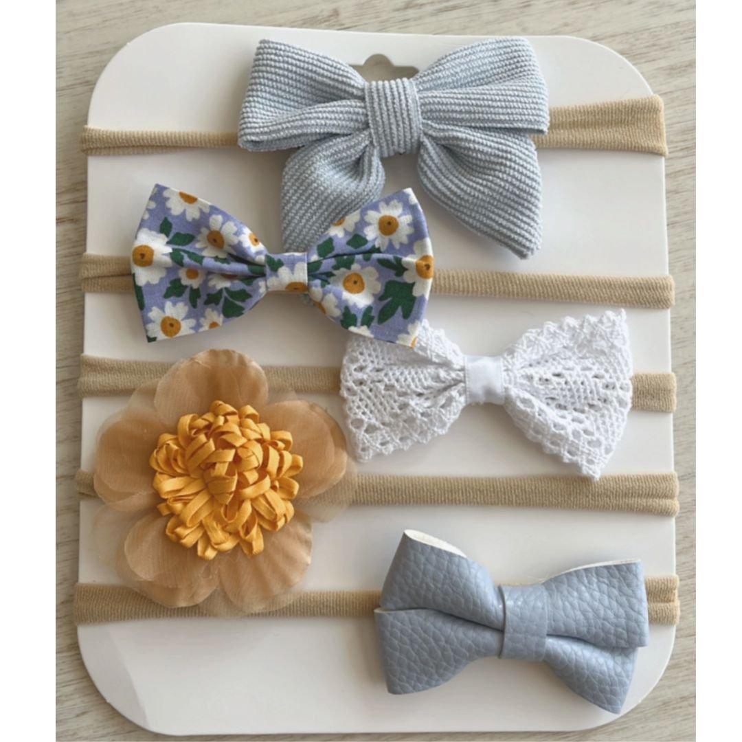 Set de cinco diademas en tonos celestes y amarillos, con diferentes diseños y texturas, desde recién nacida hasta 12 años.